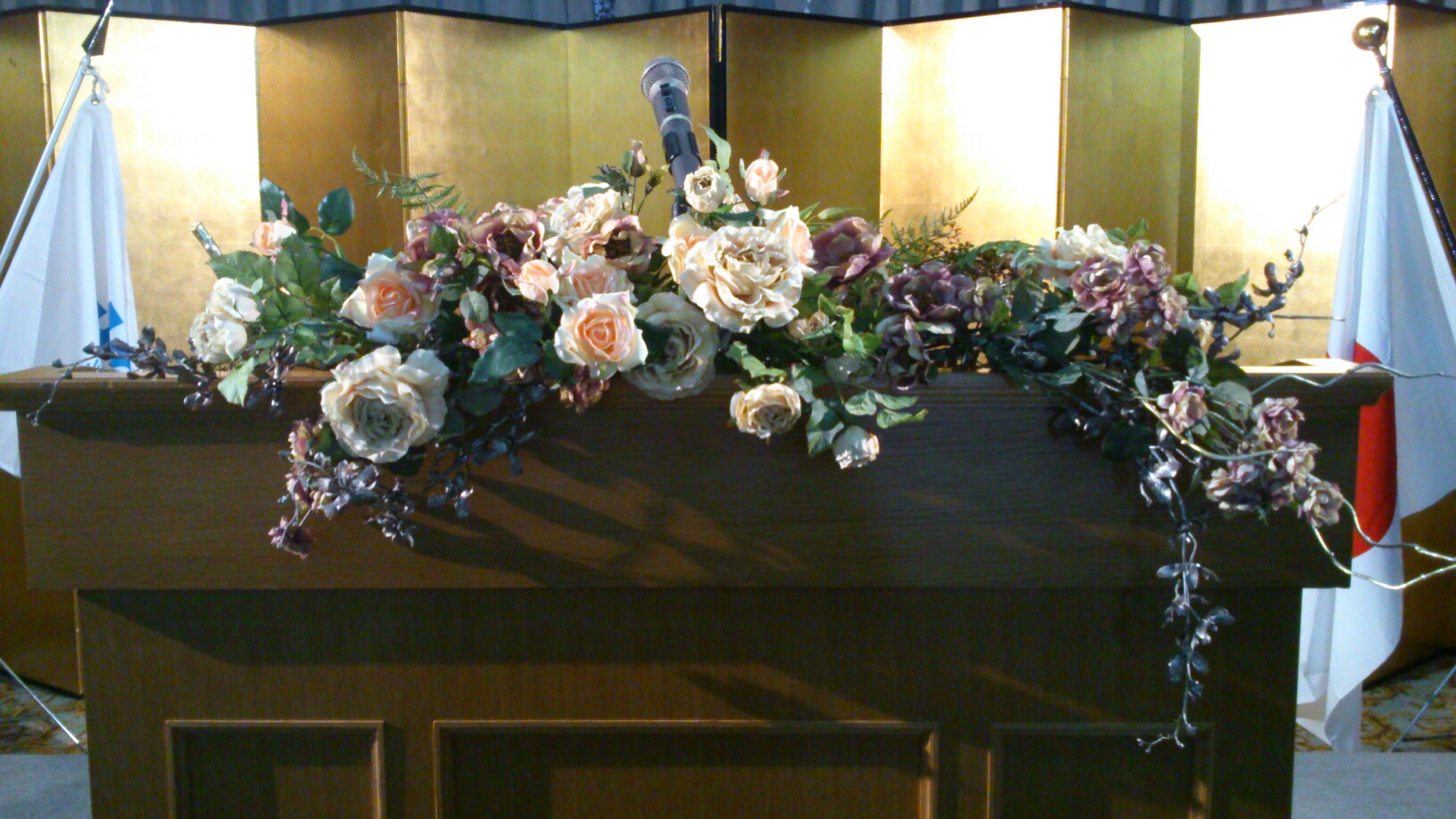 式典会場の壇上と、演台の前にレンタルでアレンジをお届けしてきました。